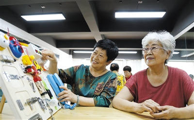 7月14日,在邢台市襄都区西门里街道办事处顺德北社区康宁养老服务中心,老人在锻炼手脑协调能力。