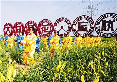 本报讯 (记者 高燕) 七月云中景色美,大同黄花分外香。15日,由国家体育总局健身气功管理中心主办的2021年全国健身气功“助力乡村振兴”志愿服务活动暨全国千村健身气功交流展示系列活动(云州站)在云州区唐家堡村有机黄花标准化种植基地举行,来自我市千名健身气功爱好者在此同练健身气功·八段锦,让美丽乡村“动”起来。