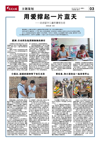 “我希望用我的所学,深入农村,走进孩子的内心,丰富留守儿童的暑假生活,对他们的人生观、价值观起到积极的影响。”贾浩德说,通过这几天与孩子们的接触,他深切意识到,大学生在享受现代社会良好教育的同时,也要肩负起相应的社会责任,唤起全社会对留守儿童这一特殊群体的关注,让他们能和其他同龄人一样感受到关爱。