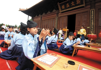 21日,我市多家幼儿园在府文庙举行了大班毕业活动。90余名大班学生身着学童汉服,在老师的带领下通过庄重的“蒙童开笔礼”仪式,告别幼儿园生活,开启人生求学的崭新篇章。图为,开笔礼“启蒙描红”环节,小朋友们准备书写“人”字。