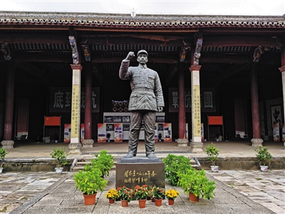 进入院内,迎面是一座周恩来塑像。他一身戎装,右手紧握拳头举起,面容刚毅,目光坚定,仿佛正作演讲。身后立柱写满了抗战标语,对面主席台背景布上“抗日必胜”字样依然醒目。我伫立塑像前,周恩来慷慨激昂、铿锵有力、充满必胜信念的声音,仿佛在耳边回响。