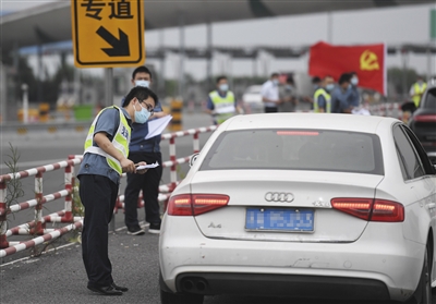 7月25日,在宁洛高速公路曹庄收费站,执法人员在查验离城车辆驾乘人员核酸证明及健康码。