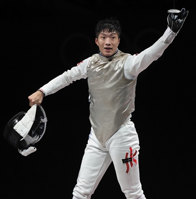 26日,在击剑项目男子个人花剑决赛中,中国香港选手张家朗战胜意大利选手加罗佐,夺得冠军。