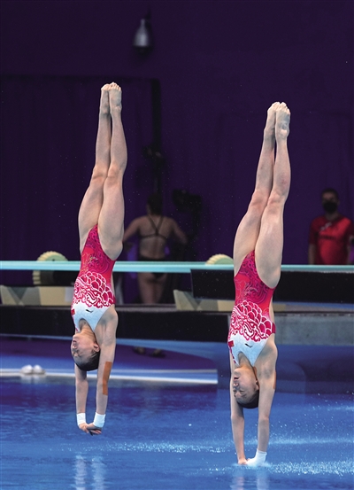 ▲ 27日,在女子双人10米台跳水比赛中,中国选手陈芋汐/张家齐以领先对手美国队52.98分的优势锁定冠军。