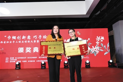本报讯 (记者 辛雅君) 7月28日,山西省妇女手工创业创新大赛颁奖典礼在市雕塑博物馆举行,有33个项目进入决赛,经过激烈角逐,来自我市的斑斓虎创意工坊、天镇县卡卡手创分获银奖和铜奖。