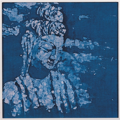 蓝底白花的布面上,大佛眉眼细长,双耳垂肩,嘴角上扬,表情严肃庄重却又慈祥和蔼。用蜡刀蘸熔蜡绘花于布后以蓝靛浸染,既染去蜡后,垂目微笑的大佛跨越千年,以原始古朴的方式来到观者眼前。看似朴实的作品,每一个花纹都值得细细品味,蓝与白的结合,给人以宁静高雅的艺术之感。