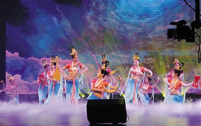 两年前,朱锦开始关注大同文创。她一直在思考,如何能通过作品把大同的文化资源进行创造与提升?在她心里,云冈石窟是多元文化融合形成的中国化艺术风格的石窟,是古代中西文化交流的历史见证,最能代表大同的文化品位。所谓近水楼台先得月,为从造像中获得创作灵感,朱锦自己也数不清到底去了多少次云冈石窟。此外,她还查阅了《云冈服饰文化研究》《云冈日录》等相关资料。2019年10月,《云冈伎乐天舞》亮相中国(青岛)艺术博览会,委婉悠扬的古乐中,舞蹈演员用优美的舞姿演绎出了北魏文化绚丽多姿的风格特征,在动态中表现了佛国仙境的美妙和谐,大家所穿的艳丽飘逸的表演服就是由朱锦设计的。