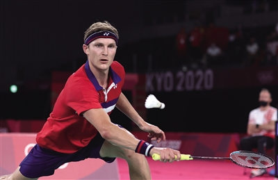 8月2日,在东京奥运会羽毛球男子单打决赛中,丹麦选手安塞龙战胜中国选手谌龙,夺得冠军。图为安塞龙在比赛中回球。