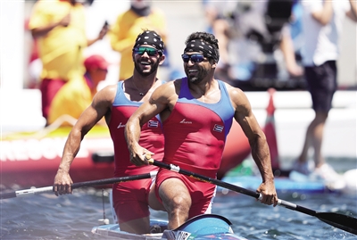 8月3日,在东京奥运会皮划艇静水男子1000米双人划艇决赛中,古巴选手托雷斯·马德里加尔/豪尔赫·恩里克斯获得冠军。图为古巴选手托雷斯·马德里加尔(右)/豪尔赫·恩里克斯在赛后庆祝。