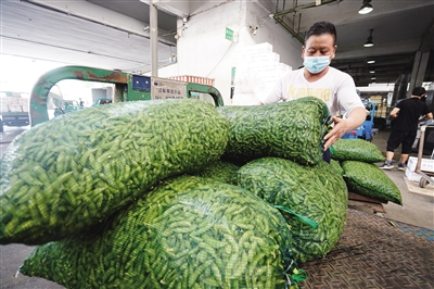 ▶8月3日,在南京农副产品物流配送中心,商户在装运蔬菜。