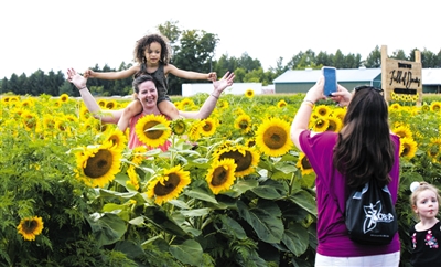 8月2日,游客在加拿大安大略省卡利登的向日葵节上拍照。