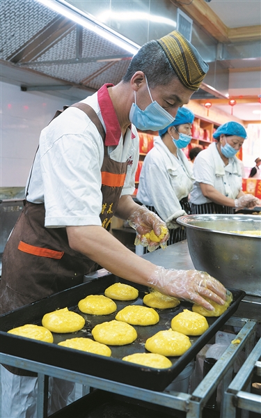 夏日的一个早上,记者来到位于明堂公园的“马兵月饼”店。一踏进店内,浓浓的香甜味扑面而来。这个门店集销售与加工于一体,明档加工月饼。师傅们各司其职,有条不紊地忙碌着。加工带馅月饼的师傅们虽是手工制作,但俨然像一条流水线,称重、包制、脱模,放入烤盘;制作混糖月饼程序要简单一些,和好的面在师傅们的手中稍微团一下便放入烤盘。一个混糖月饼重3两3—3两5之间,3个月饼1斤重,师傅们全凭手感。“这都是干了10多年的老师傅了,比秤称得还准。”一位负责人对记者说。