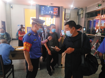 图为城管队员在大同火车站查验旅客健康码、行程码。