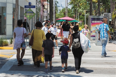 8月6日,人们在美国佛罗里达州迈阿密-戴德县的一个商业区游览。