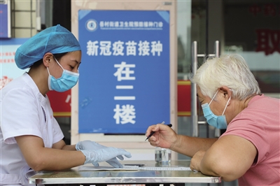 8月14日,在温县岳村街道卫生院新冠疫苗接种点,工作人员(左)在指导居民填写个人信息。