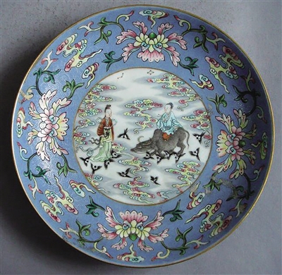 在北京艺术博物馆,有一件清代景德镇官窑粉彩人物图盘,成为古人过七夕节的见证。这件盘子口径14.4厘米,底径9厘米,高2.9厘米。采用拉坯成型工艺,制作规整,装饰极为讲究。不仅口沿涂金,其内、外壁还采用了清代中期十分流行的“粉彩轧道”工艺,即在天蓝釉地上先剔划出浅浅的卷草纹,然后再在其上饰以粉彩花卉纹与朵云纹。