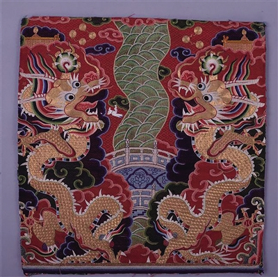 在北京艺术博物馆,一件红纱地洒线绣云水金龙纹方补(下图)诉说着古人服饰上的七夕元素。这件龙纹方补纵38cm,横37cm,以红色方孔纱为地,用各色彩绒绣线及捻金线绣制云龙等图案。方补正中一道天河贯通上下,河中波涛滚滚,水势盛大,河上横架一座雕栏拱桥;桥两端的云海中,两条金龙爪握火珠,相向腾舞,龙嘴大张,须发飘飞,形态威武有力;双龙上方各有星辰高悬于天际,并有楼阁檐顶在云雾中若隐若现,展现出一片仙界的奇幻景致。