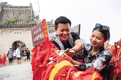 8月14日,来自广东省东莞市的一对夫妇在陕西省的西岳华山景区金锁关共同锁上连心锁。