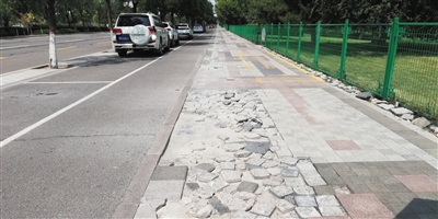 15日上午,记者在文瀛北路市图书馆对面的人行便道上看到了破损的路面。破损路面向两侧延伸有10多米,形成多个面积大小不一的破洞,里面散落着脱落的便道砖块,还有一些则被人为码放在路边绿化带护栏旁。由于毗邻文瀛湖和图书馆,不少市民会从该处经过,记者观察期间不时有车辆来往经过,车轮碾压在破损路面上发出刺耳的响声,市民路过也只好绕行,有的家长会不断提醒孩子注意安全。