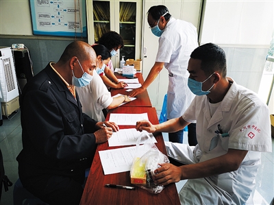 10日是今年末伏的第一天,虽已立秋,但天气依然闷热。在市中医医院新冠疫苗接种点,市民在工作人员的引导下有序接种。“请出示一下您的健康码、行程码,把您的身份证给我。”“刚接到上级通知,目前暂时只给18周岁以上第一针及18周岁以上6月16日之前接种过第一针的人群接种疫苗。”“您有高血压、糖尿病等慢性病吗?平日里吃什么药?跟我说一说……”不到8时,霍晓波已与同事开始了一天的工作。他忙着拉起隔离绳建起预约和现场排队两个通道,规范排队秩序,并提醒接种者保持安全距离。随后按要求查验健康码、行程码,并扫身份证确认接种者的信息。期间不时有市民向他咨询接种疫苗的相关问题,他总是有问必答,哪怕同样的问题,他的回答依然洪亮、充满热情。在留观区,他穿梭其间,不断叮嘱受种者接种后注意事项;在健康询问和知情告知区,他仔细询问接种者的健康情况,并耐心解答问题……