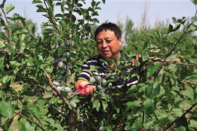 图为星荣农牧公司技术员正在对西梅进行监测、修剪。