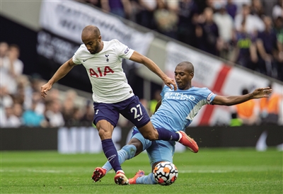 ▼ 15日,在2021-2022赛季西甲联赛首轮比赛中,巴塞罗那队主场以4∶2战胜皇家社会队。图为巴塞罗那队球员德斯特(左)与皇家社会队球员勒诺尔芒在比赛中拼抢。