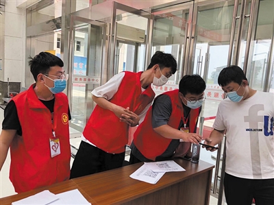 “您好,请您出示一下健康码。”“大家排队请保持安全距离。”……在浑源县政务服务中心大厅,记者看到身着红马甲的大学生志愿者礼貌地接待着前来办事的群众,有条不紊地进行疫情防控工作。据了解,为充实基层防疫力量,7月初,浑源县学雷锋志愿者协会发出大学生志愿者招募令,通过筛选、自我防护知识和志愿服务内容等岗前培训后,150名返乡大学生志愿者分批次进入县党群服务中心和县政务服务中心,配合工作人员参与疫情防控值班点值班、检测体温、登记出入信息、查验行程码和健康码等工作,积极向群众宣传防疫知识。