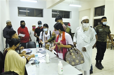 ◀ 8月18日,人们在孟加拉国达卡一处接种点准备接种中国国药新冠疫苗。