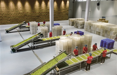 图为8月22日,在云州区坊城新村黄花产业园加工线上,工作人员正在对黄花进行筛选加工。