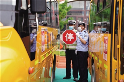 8月22日,在河北邢台经济开发区一幼儿园,河北省邢台市公安交警支队开发区大队民警检查校车停车牌。