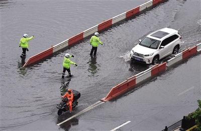▲ 8月22日,交警在郑州市花园路冒雨指挥交通。