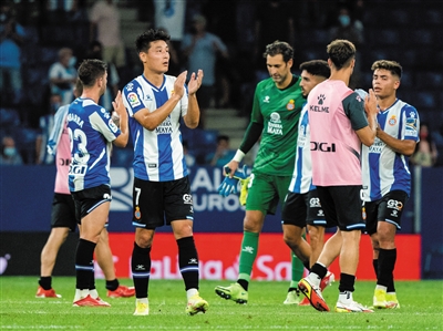 21日,西班牙人队球员武磊(左三)在赛后向球迷致意。