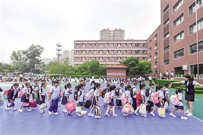 8月23日,在长春五十二中赫行实验学校小学部,教师带领学生入校。