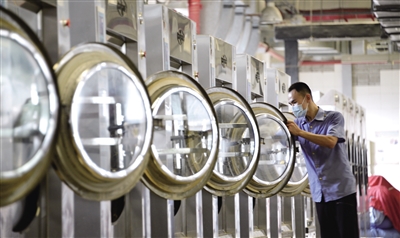 8月23日,北京客运段洗涤车间的工作人员在进行洗涤前设备清洁消毒工作。
