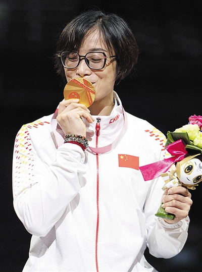 8月25日,中国选手边静在颁奖仪式上亲吻金牌。