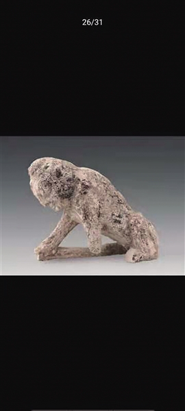 木质镇墓兽1件,木雕已完全腐朽,石膏灰浆灌注填充提取,人面兽身。头部略下垂,高阔鼻,嘴角上扬。前肢直立,后肢屈蹲,后肢前端与前肢相连。面部涂红彩,其余部位涂黑彩,身长48厘米、残高30厘米。