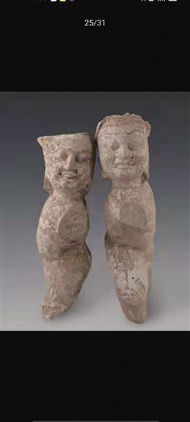 出土的木质镇墓俑2件,木雕已完全腐朽,用石膏灰浆灌注填充提取。木雕头戴兜鏊,粗眉弯曲,双目圆睁,尖鼻高耸,嘴角宽厚,“八”字胡,上身前倾扭胯,四肢残,前腿微屈。面部眉、眼、胡须涂黑彩,其余部分均涂红彩。其中一件标本残高54厘米,另一件残高60厘米。