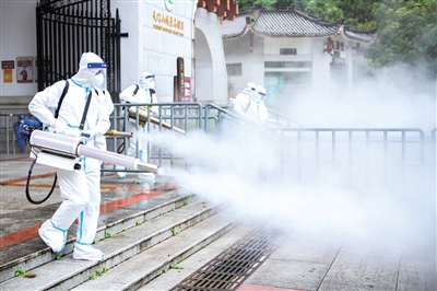 当日,在湖南省张家界市天门山景区,工作人员抓紧消杀作业,为重新开园做好准备工作。据了解,张家界市8月25日已全域调整为低风险地区。