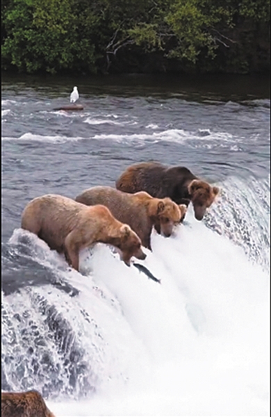 熊:大哥二哥,这鱼自己往我嘴里跳。