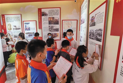 在高山镇党群服务中心党史馆,每位少先队员领到一张“学习党史感党恩”研学试卷后,在参观过程中填写答卷、交流讨论。高山镇相关负责人为少先队员们介绍了脱贫攻坚成果,以生动的故事讲解了采煤沉陷区综合治理工程、易地搬迁安置、光伏发电、小杂粮种植、“高山大嫂”农家菜铺团购送菜等。