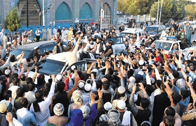 这是8月31日在阿富汗北部巴尔赫省首府马扎里沙里夫拍摄的塔利班人员和民众。