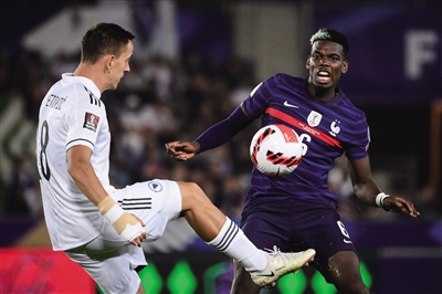 9月1日,在法国斯特拉斯堡举行的2022卡塔尔世界杯预选赛欧洲区小组赛D组比赛中,法国队主场以1∶1战平波黑队。图为法国队球员博格巴(右)和波黑队球员哈济亚赫梅托维奇在比赛中拼抢。