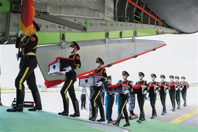 9时,中韩双方在韩国仁川国际机场举行志愿军烈士遗骸交接仪式。11时26分,空军专机平稳降落在辽宁沈阳桃仙国际机场。专机进入中国领空后,空军两架战斗机护航,向志愿军烈士致以崇高敬意,沈阳桃仙国际机场以“过水门”最高礼遇迎接志愿军烈士回家。