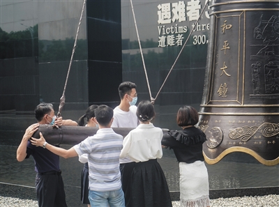 9月3日,人们在侵华日军南京大屠杀遇难同胞纪念馆撞响和平大钟。