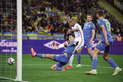 ▼ 9月4日,在乌克兰基辅进行的2022年卡塔尔世界杯预选赛欧洲区小组赛D组比赛中,法国队客场以1∶1战平乌克兰队。图为法国队球员马夏尔(左二)在比赛中破门。