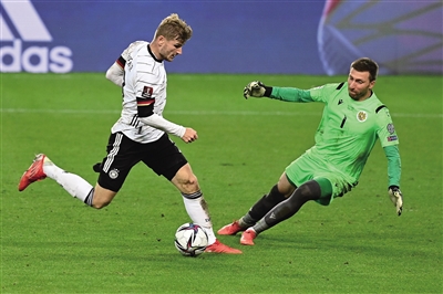 9月5日,在德国斯图加特进行的2022年卡塔尔世界杯预选赛欧洲区小组赛J组比赛中,德国队主场以6∶0战胜亚美尼亚队。图为德国队球员维尔纳 (左)在比赛中与亚美尼亚队守门员尤尔琴科拼抢。