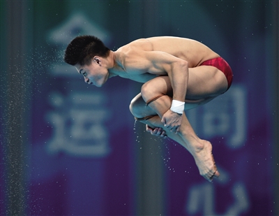 9月7日,在第十四届全运会跳水项目男子团体10米跳台比赛中,四川队选手杨健获得第一名。图为四川队选手杨健在比赛中。