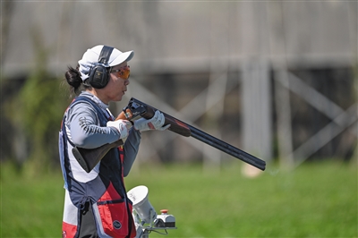 9月8日,在西安举行的第十四届全运会射击女子飞碟多向决赛中,湖南队选手刘英姿以43中的成绩夺得冠军,湖南队选手王舒颖以42中的成绩获得亚军,山东队选手朱靖宇以34中的成绩获得季军。图为湖南队选手刘英姿在射击女子飞碟多向决赛中。