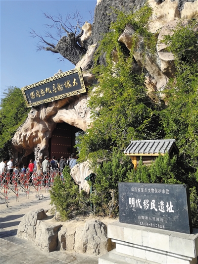 忽然间,悲壮的音乐响起,循声寻去,只见大槐树下正在上演《大槐树移民》的情景剧。一部凄凉悲壮的移民历史,就从大槐树下拉开了骨肉分离的序幕。“凡五口之家迁二,六口之家迁三,七口之家迁四,八口之家迁五,有丁无地之家全迁。” 自明代洪武六年(1373年)至永乐十五年(1417年)近五十年内,先后从山西组织了十八次大移民,迁徙数百万人口,涉及1230个姓氏。每一次移民,都是生离死别的老家难舍;每一次移民,都是舍家弃业的热土难离;每一次移民,都是千辛万苦的拓荒重建。