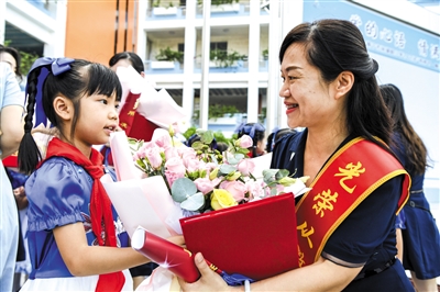 9月10日,在广西南宁市滨湖路小学,学生向老师送上教师节祝福。
